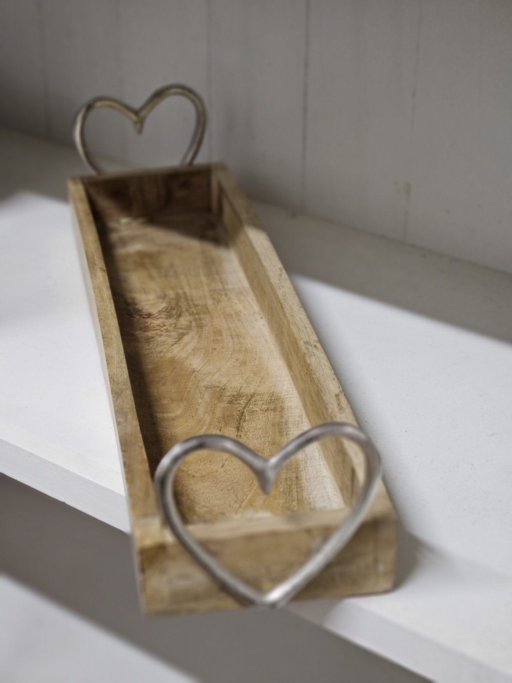 Drevená servírovacia tácka s kovovými úchytkami v tvare srdca
